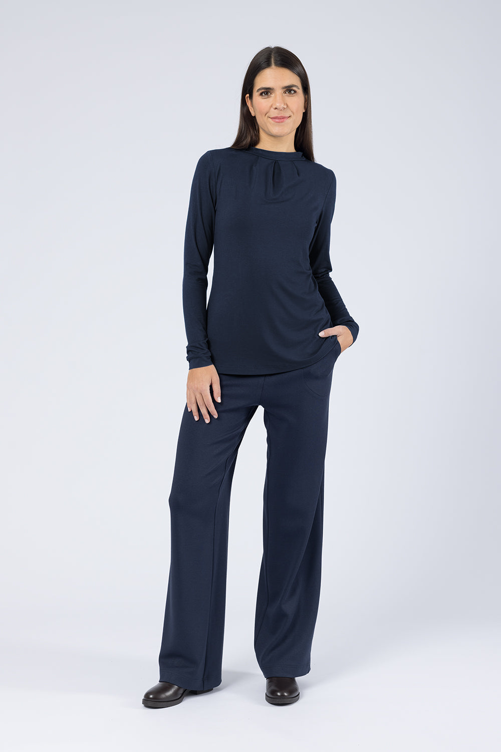 "Mary" is a high-necked, long-sleeved top. The small stand-up collar has a short slit on the back and is fastened with ribbons. The loose fit is due to the slight waistline, as well as the folds in the middle of the front neckline. This creates a beautiful, soft drape that enhances the simplicity of the top.